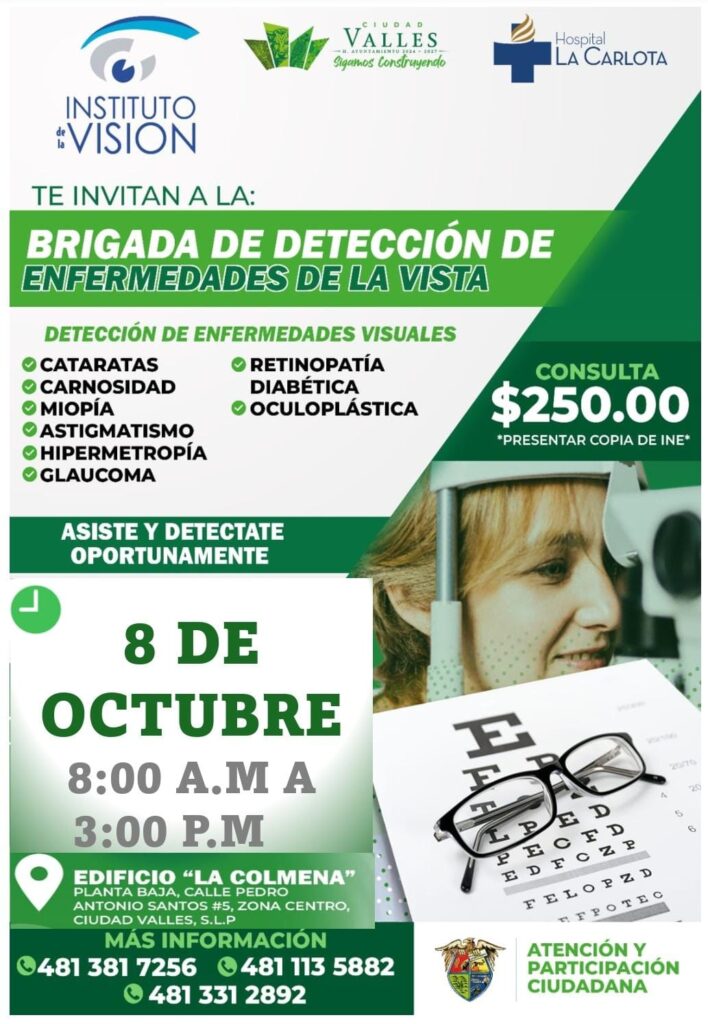El H. Ayuntamiento de Ciudad Valles, a través de la Dirección de Participación Ciudadana, y en colaboración con el Instituto de la Visión y el Hospital La Carlota de Montemorelos, Nuevo León, invitan a la población a acudir a la brigada de detección de enfermedades de la vista.