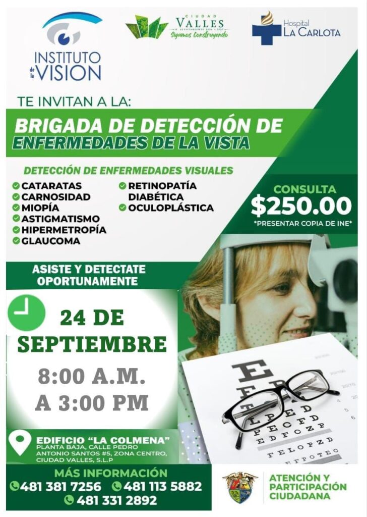 El H. Ayuntamiento de Ciudad Valles, a través de la Dirección de Participación Ciudadana, y en colaboración con el Instituto de la Visión y el Hospital La Carlota de Montemorelos, Nuevo León, invitan a la población a acudir a la brigada de detección de enfermedades de la vista.