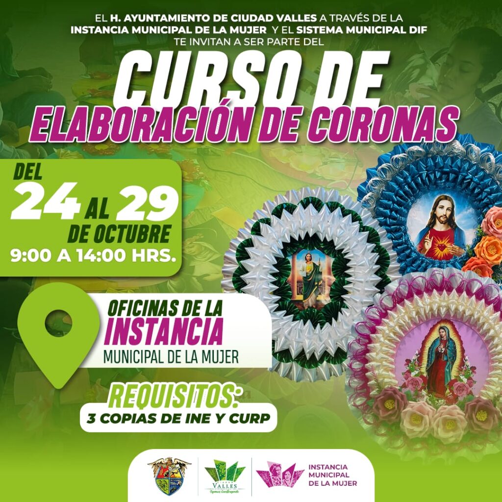 El H. Ayuntamiento de Ciudad Valles, a través de la Instancia Municipal de la Mujer y el Sistema Municipal DIF, te invita a participar en el Curso de Elaboración de Coronas.