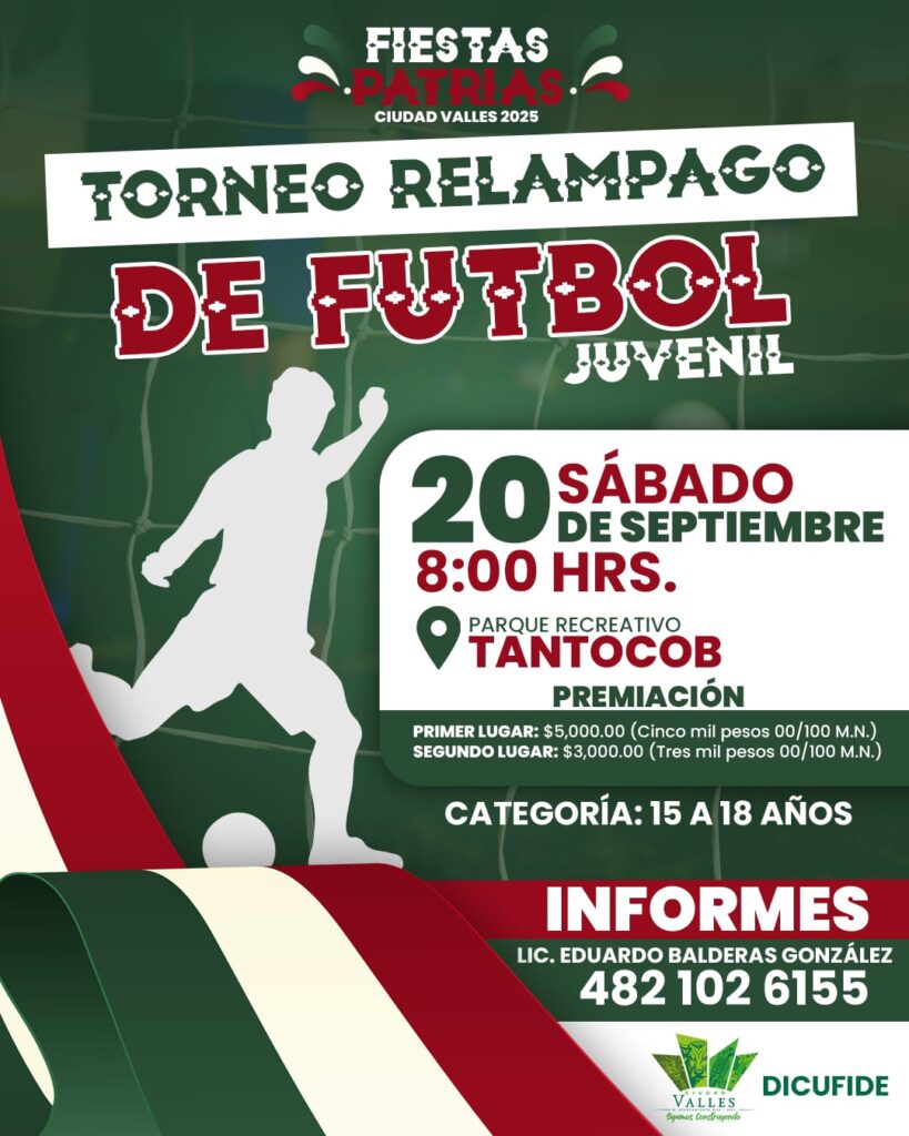 La Dirección de Cultura Física y Deporte te invita a participar en el Torneo Relámpago de Futbol 11 Juvenil, que se llevará a cabo este sábado 20 de septiembre en el Parque Tantocob.
