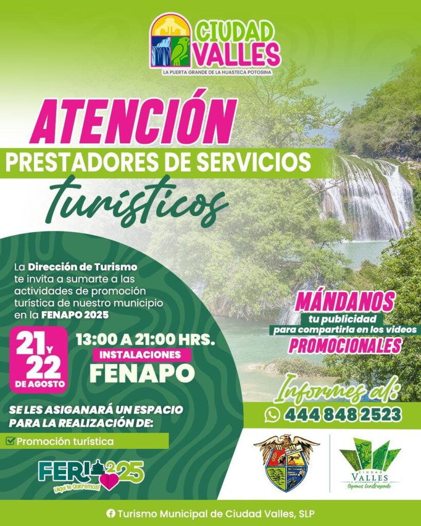 La Dirección de Turismo del H. Ayuntamiento de Ciudad Valles, a cargo de Vernice Soria Treviño, invita a los prestadores de servicios turísticos a sumarse a las actividades de promoción que se estarán realizando por parte del municipio en la FENAPO 2025.