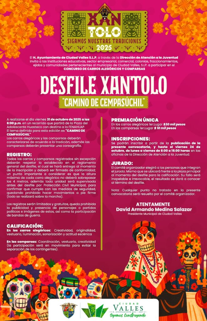 El H. Ayuntamiento de Ciudad Valles, a través de la Dirección de Atención a la Juventud, extiende la invitación a instituciones educativas, sector empresarial, comercial, colonias, comunidades y demás interesados para que participen en el concurso de carros alegóricos y comparsas, que se estará realizando el día 31 de octubre en punto de las 18:00 horas, y que partirá desde la Plaza del Adolescente Huasteco.