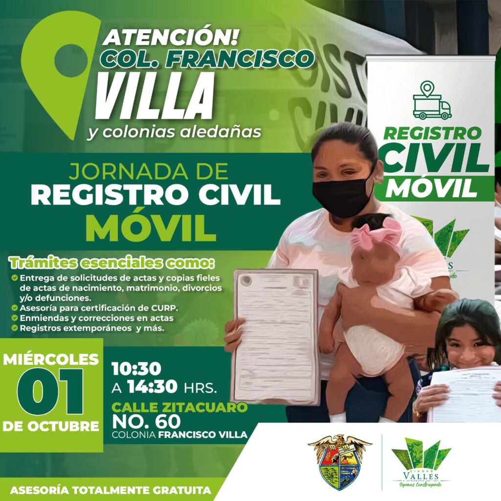 Este miércoles 01 de octubre, el H. Ayuntamiento de Ciudad Valles, a través de las Oficialías 03 y 04 del Registro Civil, se llevará a cabo una jornada de atención para habitantes y vecinos de la colonia Francisco Villa a partir de las 10:30 horas y hasta las 14:30 horas.