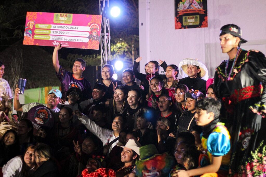 En el cierre del Festival Xantolo 2025 “Sigamos Nuestras Tradiciones”, miles de familias se reunieron en los terrenos de la feria para ser testigos de este evento, donde el segundo lugar lo obtuvo la comparsa de Ciudad Valles, compuesta por integrantes de las comparsas Parranda El Consuelo y Corazón Huasteco, quienes se llevaron un premio por la cantidad de 20 mil pesos; el tercer lugar fue para “La Tradicional de Matlapa”, llevándose un incentivo económico por 10 mil pesos.